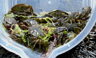 Mostly you will catch boring, docile shore crabs. Yawn. For some real crabby action you need low tide. The lower the better. Out on the seaweedy rocks you'll catch (if you can) Velvet Swimming Crabs. BE VERY AFRAID. Shore crabs grab your bait and sit there eating it - Velvet Swimmers grab it and drag it under a rock. Try and pull them up and they let go - they have brains and they are watching you with their scarlet eyes. Some of them swear at you. You need cunning, stealth and nerves of steel. They tangle their legs round the seaweed and pull - you on one end, it on the other. Do not call it obscene names because you will have your children with you. Get the net under it and gently scoop it up. Once in the net - shake the net! They climb out! Shaking gets it on its back in the bottom of the net - quickly get it in the bucket. Once in the bucket DO NOT PUT YOUR HAND IN! It will go for you - big time. They hate you and want you to know it.